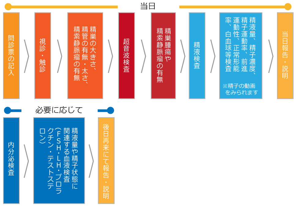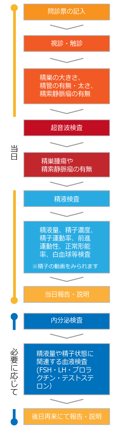 精子数が異常に少ない時や精子が確認できない場合に血液検査で行います。結果は2-3週間後の再来時に説明しますが、当院では結果に対するカウンセリングは行っておりません。